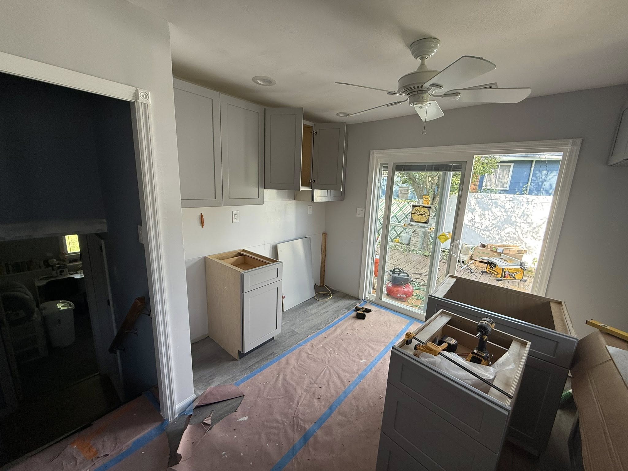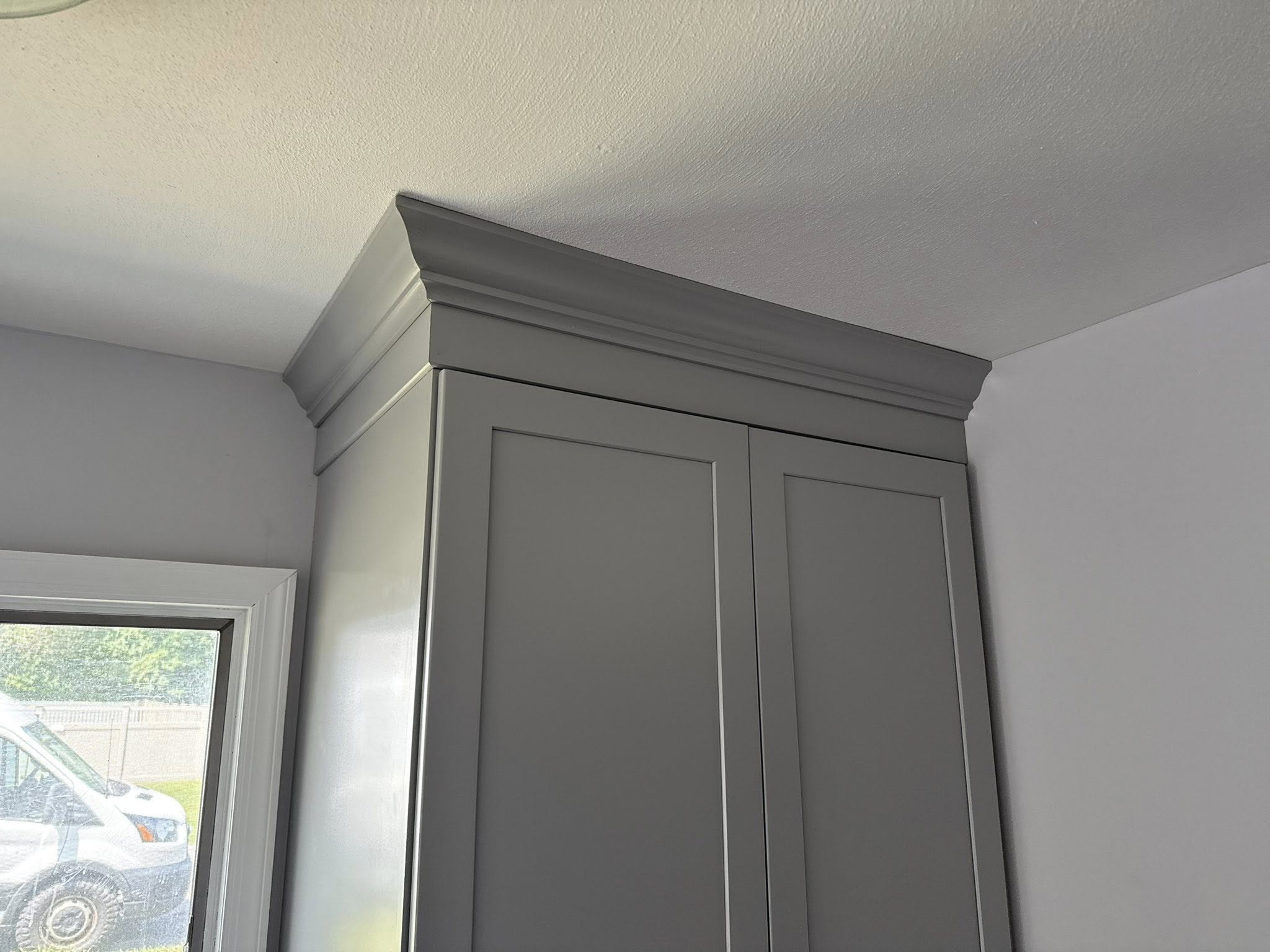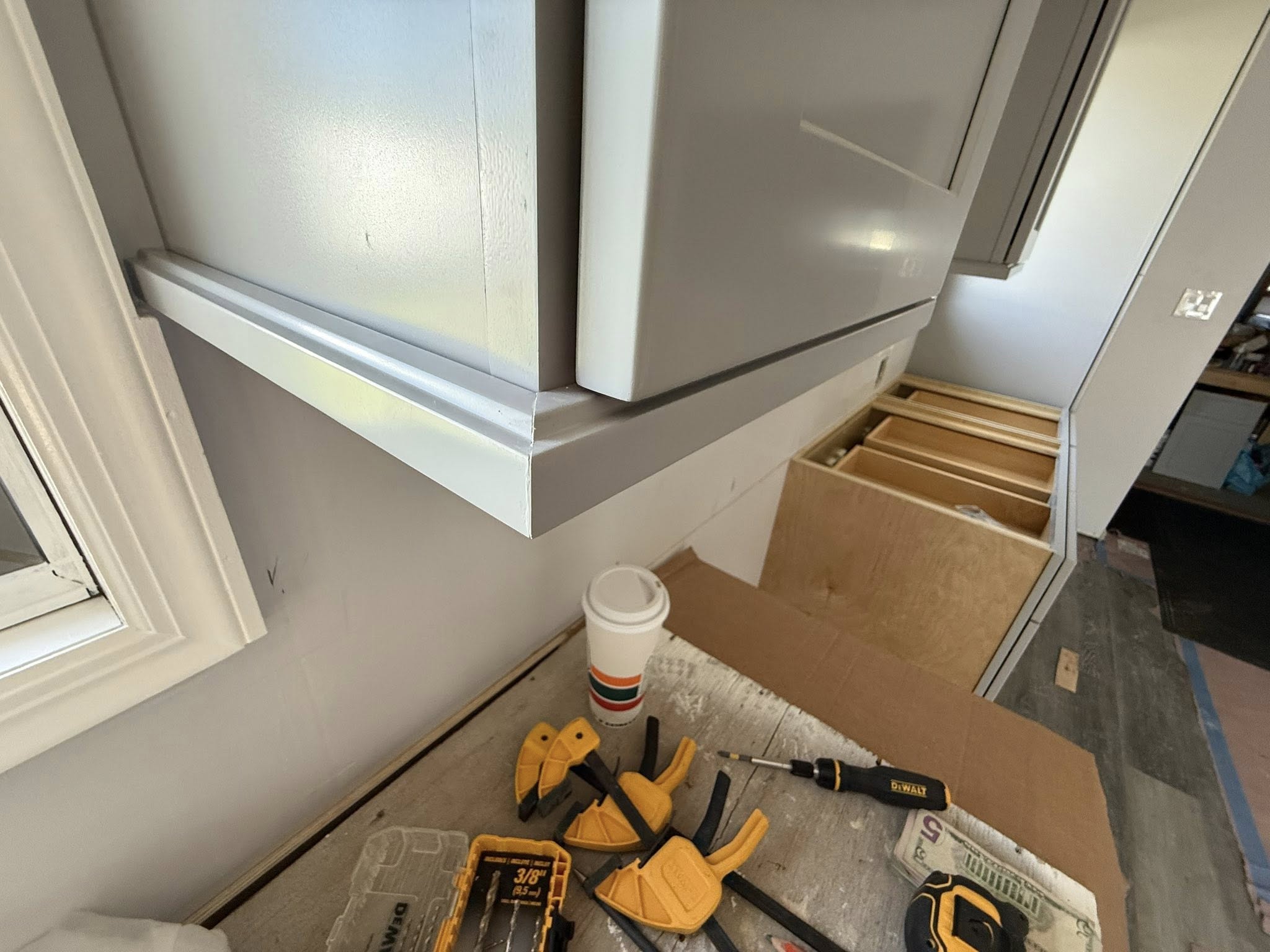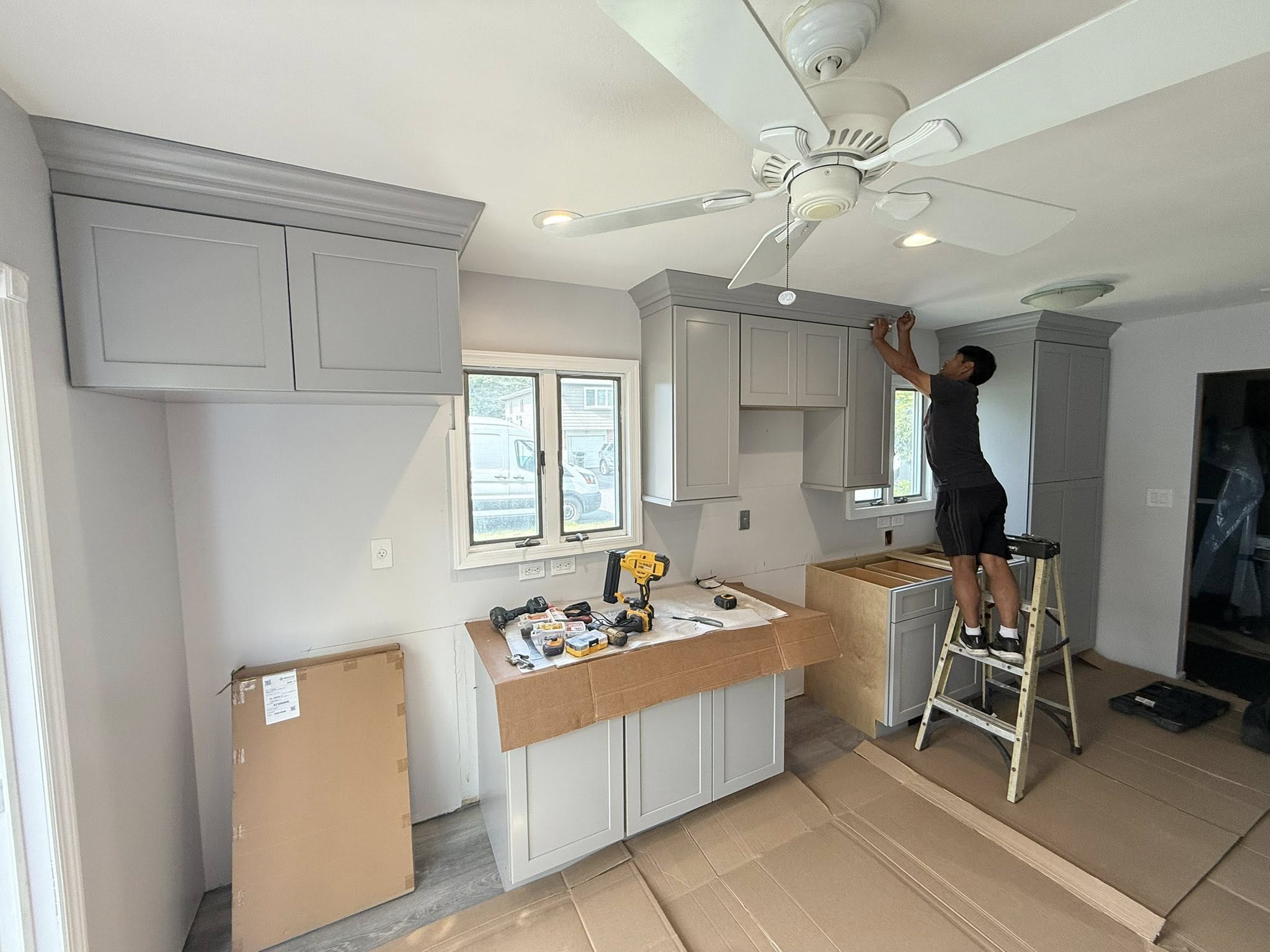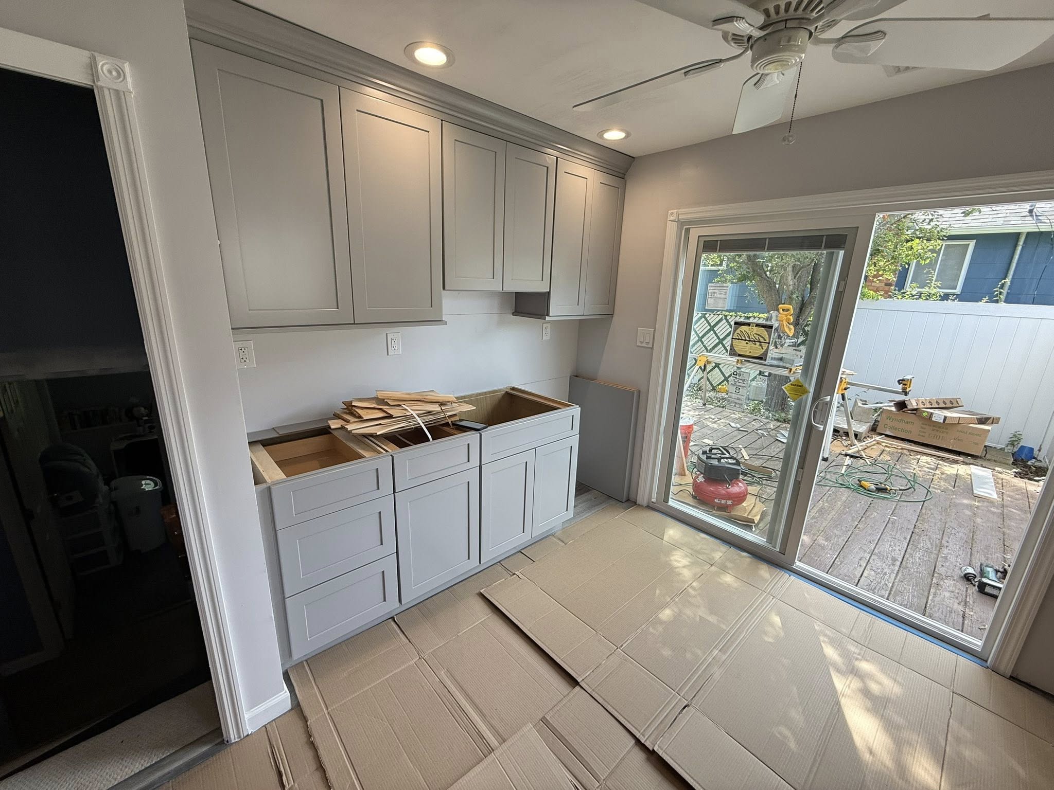 “5 shades of grey” for this kitchen remodel once the countertop and backsplash are in. High quality, low budget kitchen when you put a little extra time into the trim.